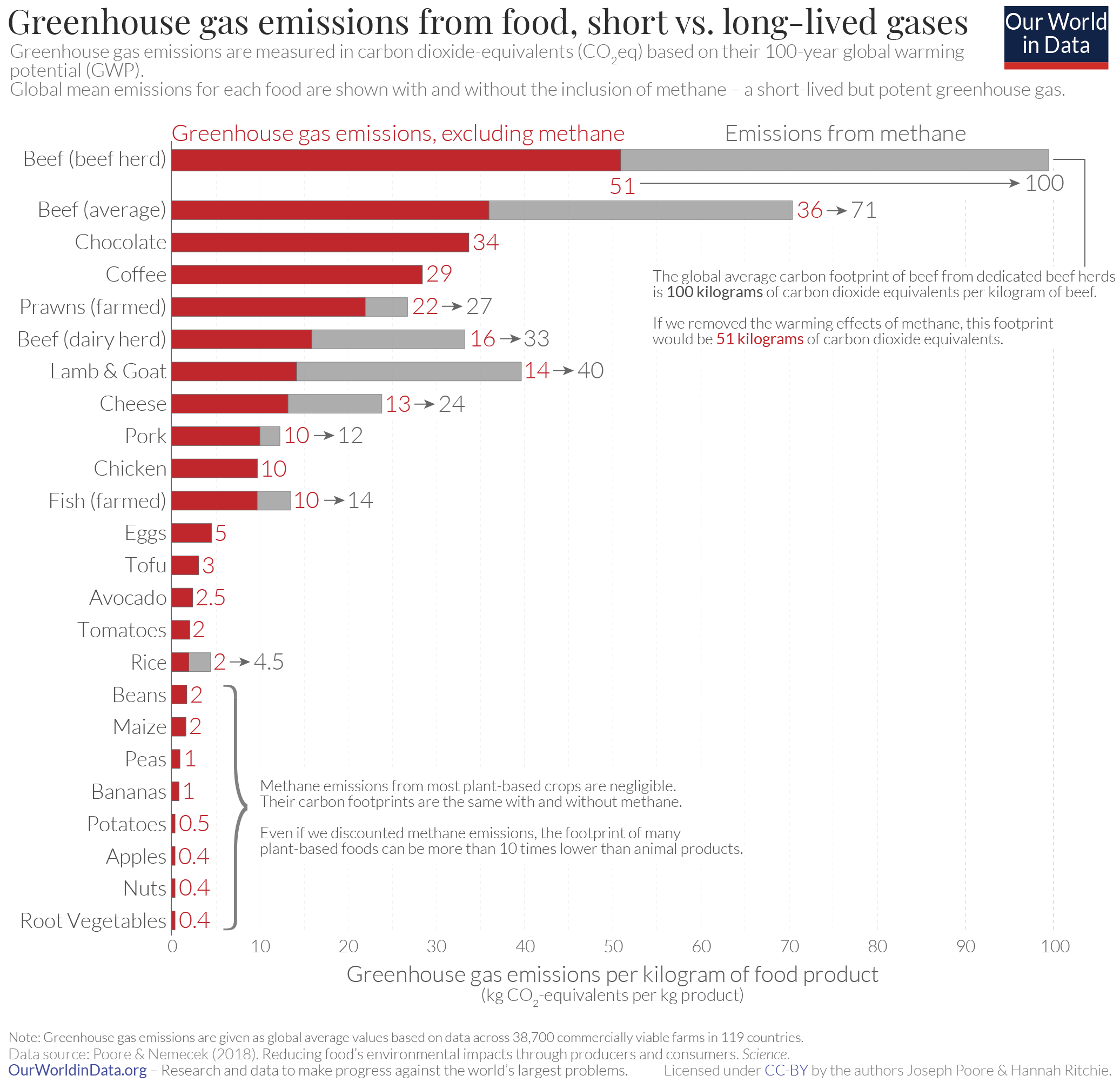 Meat (cattle in particular) is the primary source of methane emissions. Methane is a greenhouse gas and is 86 times more potent than carbon dioxide over a 20-year period.