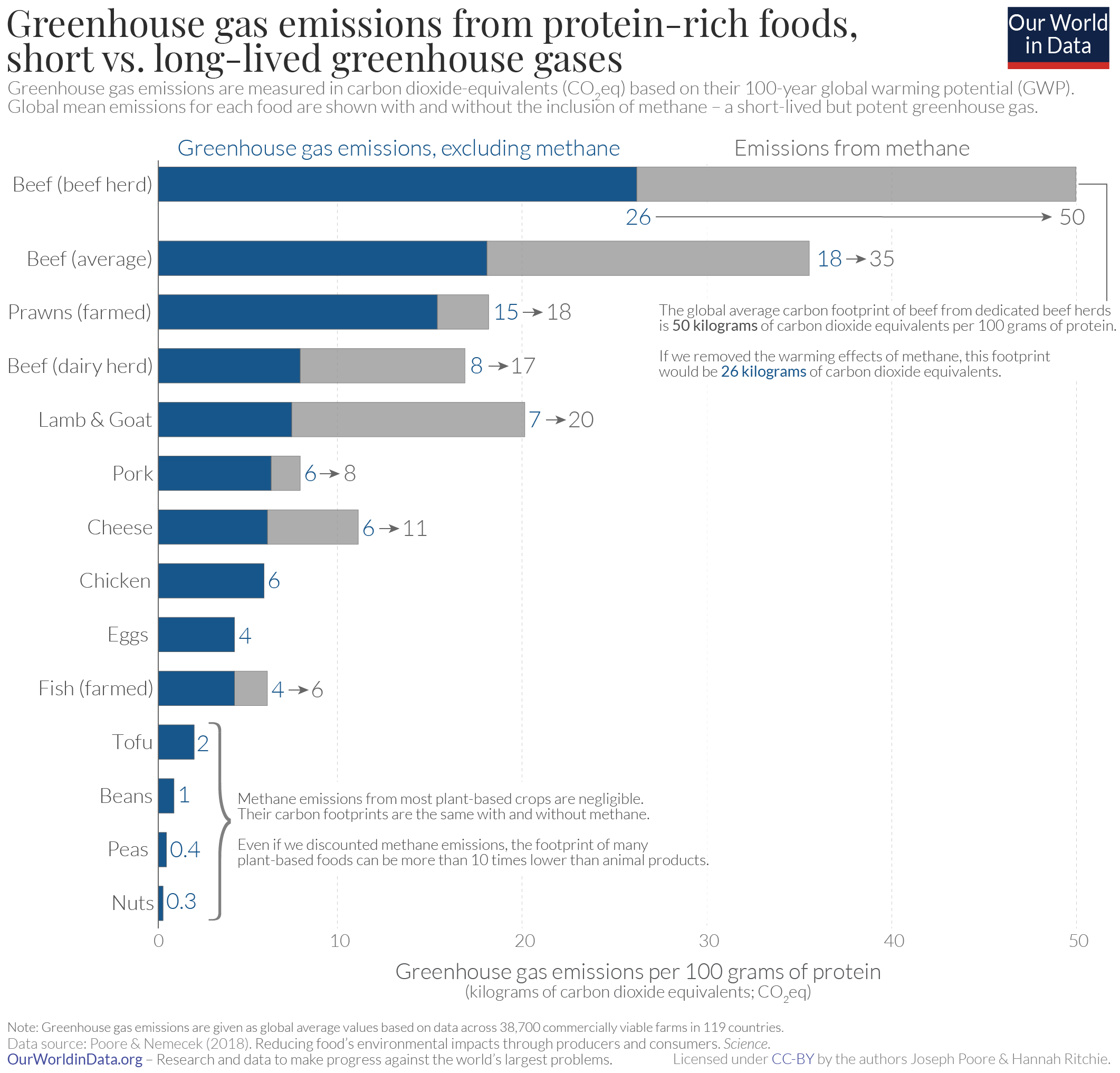 The carbon footprint of beef and lamb, both red meats, is five times higher than  that of tofu, ten times higher than beans and over twenty times higher than peas, for the same amount of protein!
